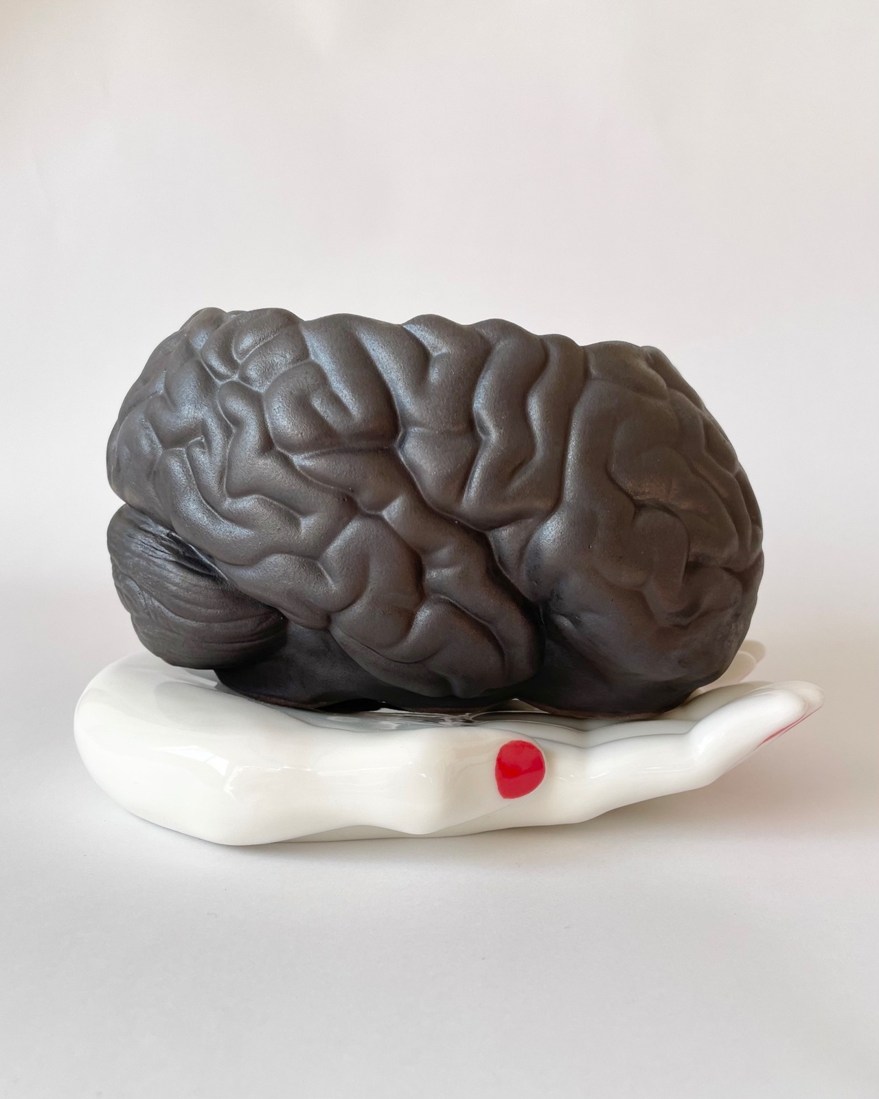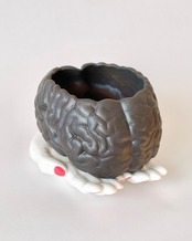 両手の上に乗った脳の形をした妖艶な黒い植木鉢「手乗りノウッ器」は、あなたのインテリアに独自の個性をもたらす魅力的なアイテムです。この作品は、シンプルでありながらも存在感があり、心に残るデザインが特徴です。